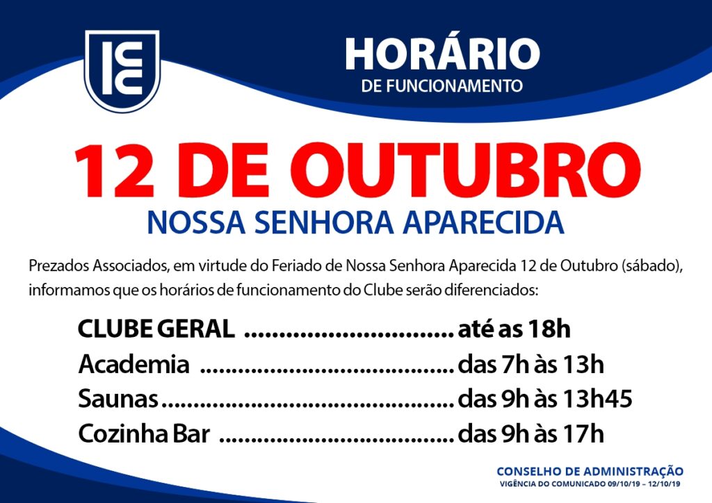 Horário de funcionamento do clube no feriado de 12 de Outubro