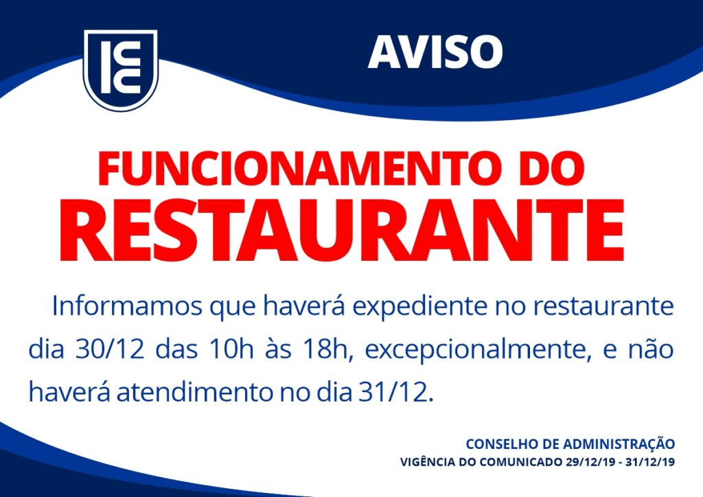 FUNCIONAMENTO DO RESTAURANTE Informamos que haverá expediente no restaurante dia 30/12 das 10h às 18h, excepcionalmente, e não haverá atendimento no dia 31/12. CONSELHO DE ADMINISTRAÇÃO VIGÊNCIA DO COMUNICADO 29/12/19 – 31/12/19
