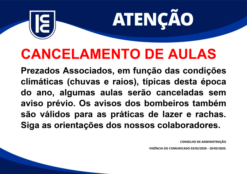 ATENÇÃO: Cancelamento de Aulas Prezados Associados, em função das condições climáticas (chuvas e raios), típicas desta época do ano, algumas aulas serão canceladas sem aviso prévio. Os avisos dos bombeiros também são válidos para as práticas de lazer e rachas. Siga as orientações dos nossos colaboradores. . Agradecemos a compreensão de todos. CONSELHO […]