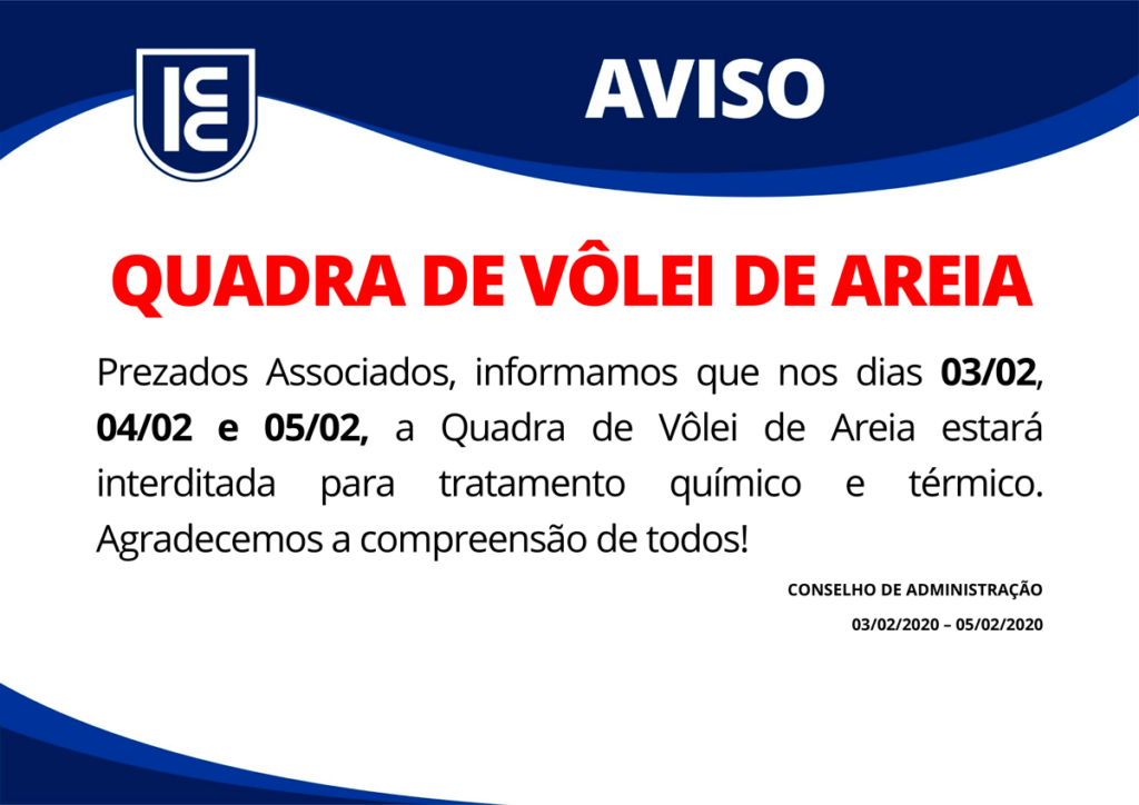 AVISO: Ginásio Interditado Prezados Associados, informamos que nos dias 03/02, 04/02 e 05/02, a Quadra de Vôlei de Areia estará interditada para tratamento químico e térmico. Agradecemos a compreensão de todos! Agradecemos a compreensão de todos. CONSELHO DE ADMINISTRAÇÃO VIGÊNCIA DO COMUNICADO 03/02/2020 – 05/02/2020