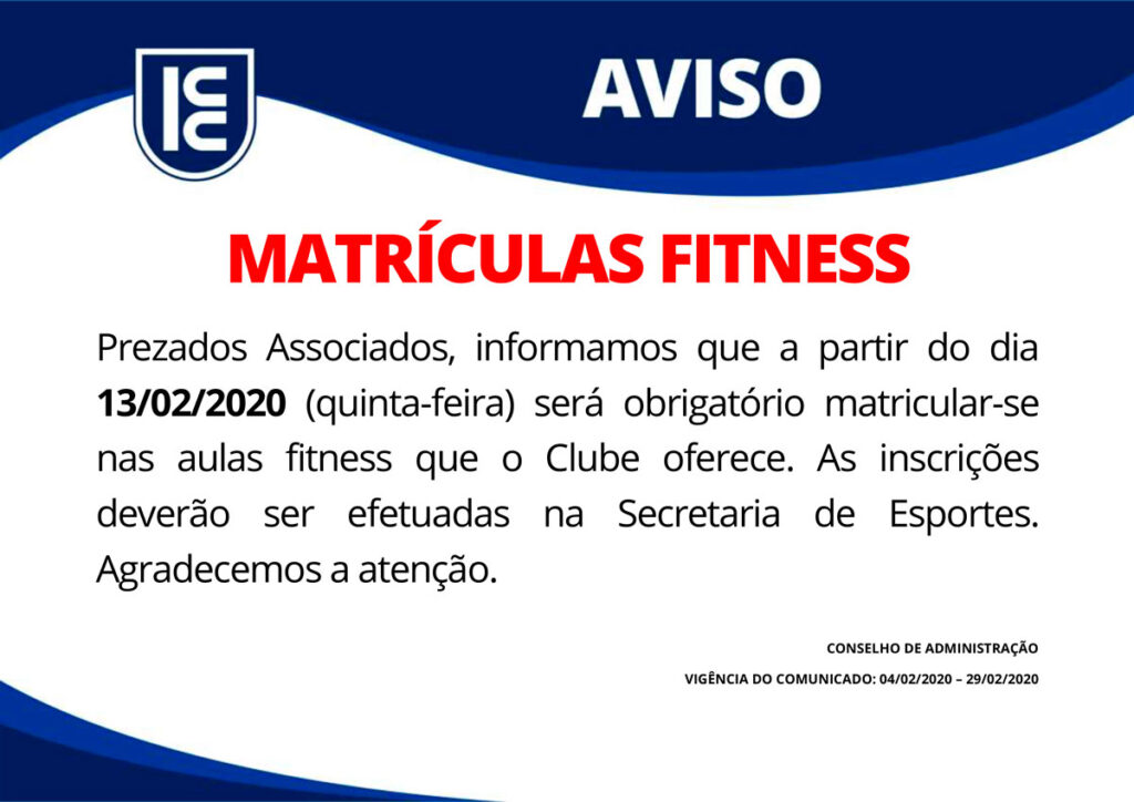 AVISO: Matrículas Fitness Prezados Associados, informamos que a partir do dia 13/02/2020 (quinta-feira) será obrigatório matricular-se nas aulas fitness que o Clube oferece. As inscrições deverão ser efetuadas na Secretaria de Esportes. Agradecemos a atenção. CONSELHO DE ADMINISTRAÇÃO VIGÊNCIA DO COMUNICADO 04/02/2020 – 29/02/2020