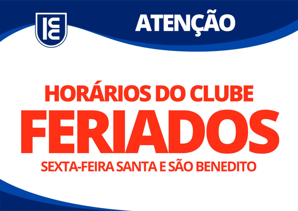 Devido ao feriado de SEXTA – FEIRA SANTA, dia 15/04/2022 e SÃO BENEDITO, dia 18/04/2022 (segunda-feira), o Clube funcionará das 06h00 às 18h00 e a ACADEMIA das 07h00 às 13h00. Contamos com a compreensão de todos.
