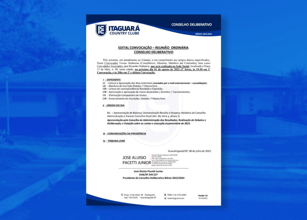 Pelo presente, em atendimento ao Estatuto, e em cumprimento aos artigos abaixo especificados, ficam Convocados Vossas Senhorias (Conselheiros, Diretores, Membros das Comissões), bem como Convidados Associados, para Reunião Ordinária, que será realizada na Sede Social, localizada à Praça 13 de Maio, n. 90, nesta cidade, no próximo dia 01 de agosto de 2022 (2ª […]