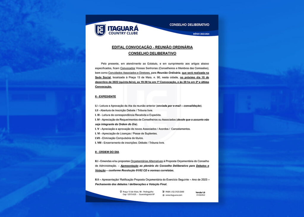 Pelo presente, em atendimento ao Estatuto, e em cumprimento aos artigos abaixo especificados, ficam Convocados Vossas Senhorias (Conselheiros e Membros das Comissões), bem como Convidados Associados e Diretores, para Reunião Ordinária, que será realizada na Sede Social, localizada à Praça 13 de Maio, n. 90, nesta cidade, no próximo dia 15 de dezembro de 2022 […]