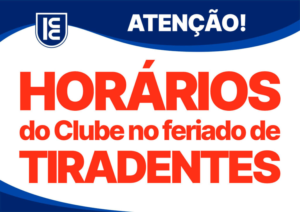 Devido ao feriado de TIRADENTES, sexta-feira, dia 21/04/2023, o Clube funcionará das 6h às 18h, ACADEMIA das 7h às 13h, SAUNA das 9h às 13h45 e neste dia NÃO HAVERÁ aulas esportivas. Contamos com a compreensão de todos.